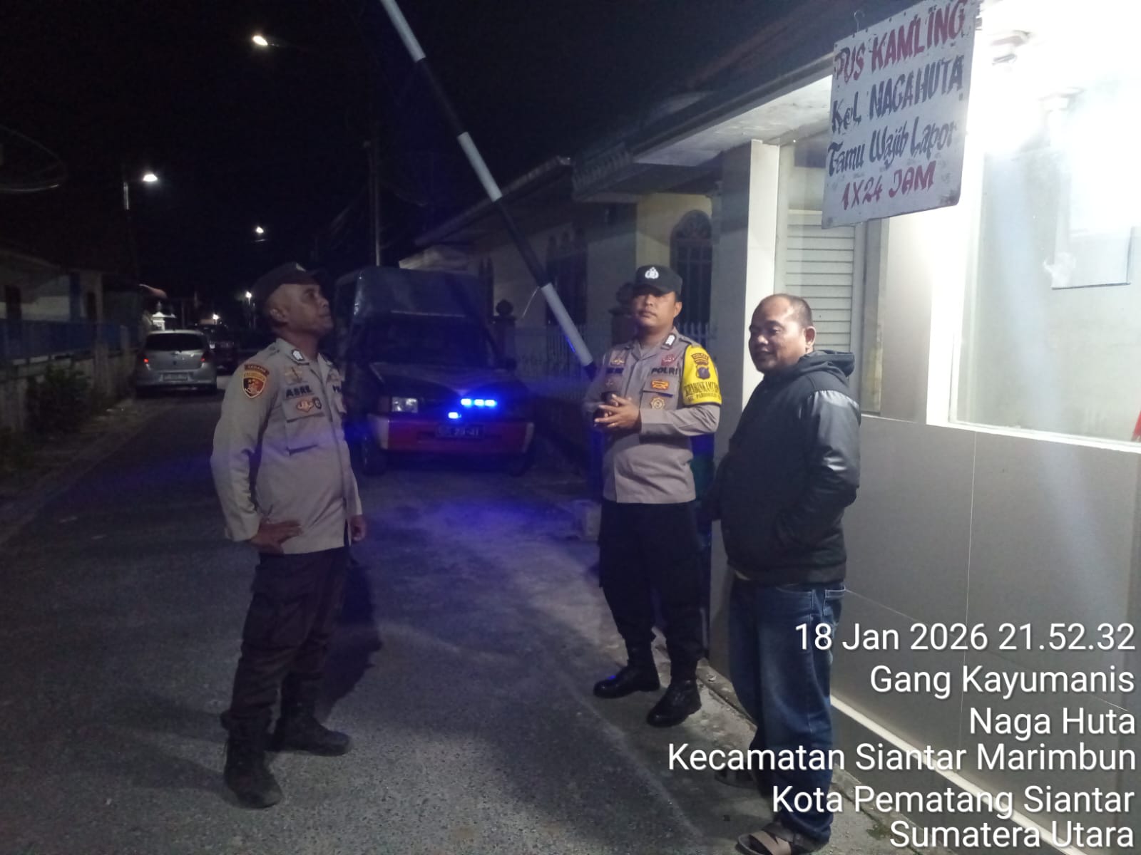 Pematangsiantar | DelikSumut – Piket Bhabinkamtibmas Polsek Siantar Marihat Polres Pematangsiantar melaksanakan kegiatan Saling (Sapa Siskamling) di Sat Kamling Perum Siantar Indah, Jalan Sisingamangaraja, Gang Kayu Manis, Kelurahan Nagahuta, Kecamatan Siantar Marimbun Kota Pematangsiantar, Minggu (18/1/2026) malam, sekira pukul 22.00 Wib.