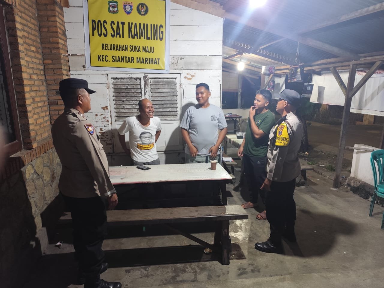 Pematangsiantar | DelikSumut – Polseķ Sianțar Marihat Polres Pematangsianțar melalui Bhabinkamtibmas AIPDA Ijon R Saragih dan AIPDA Adilman Manalu melaksanakan kegiatan Saling (Sapa Siskamling) di Pos Kamling Jalan Durian Kelurahan Suka Maju Kecamatan Siantar Marihat Kota Pematangsiantar, Selasa (13/1/2026) malam pukul 21.00 Wib.