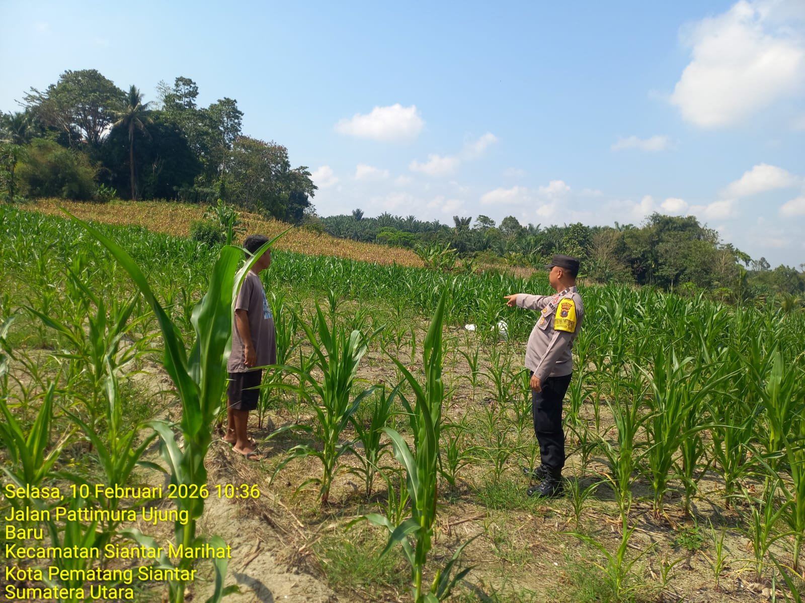 Pematangsiantar | DelikSumut – Dalam rangka mendukung Program Ketahanan Pangan (Ketapang), Polsek Siantar Marihat Polres Pematangsiantar melalui Bhabinkamtibmas Kelurahan Parhorasan Nauli AIPDA P. Butar Butar melaksanakan monitoring di Ladang Jagung warga binaan Jalan Pattimura Ujung, Kelurahan Mekar Nauli, Kecamatan Siantar Marihat, Kota Pematangsiantar, Selasa (10/2/2026) pagi sekira pukul 10.30 Wib.