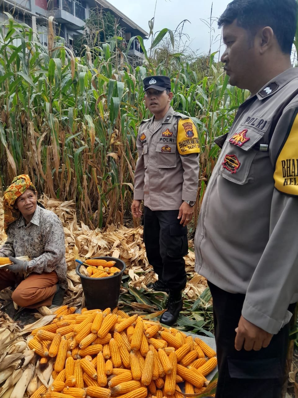 Pematangsiantar | DelikSumut – Polsek Siantar Timur Polres Pematangsiantar melalui Bhabinkamtibmas Kelurahan Pahlawan Aiptu Ungkap Hutagalung dan Bhabinkamtibmas Kelurahan Siopat Suhu sambangi warga sedang panen jagung Ibu Naudur br. Sitompul di Kompleks Kampung Universitas HKBP Nommensen, Jalan Sangnawaluh, Kelurahan Siopat Suhu, Kecamatan Siantar Timur, Kota Pematangsiantar, Selasa (14/10/2025) pagi, sekira pukul 10.00 Wib.