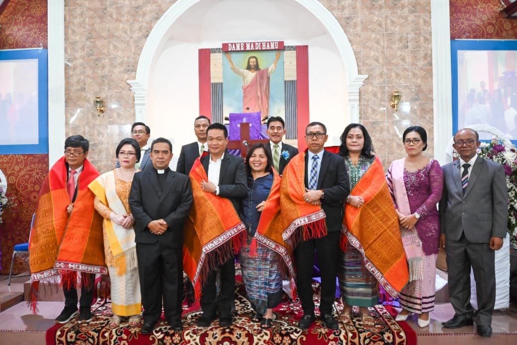 Bupati Humbahas Dr Oloan P Nababan bersama Ketua TP PKK Humbahas Ny Erma Oloan P Nababan, Sekda Chiristison Rudianto Marbun dan perangkat daerah mengikuti ibadah penutupan Sinode ke-65 sekaligus pelantikan pucuk pimpinan HKI (Huria Kristen Indonesia) di Gereja HKI Resort Khusus Medan Kota, Minggu 29 Maret 2026.