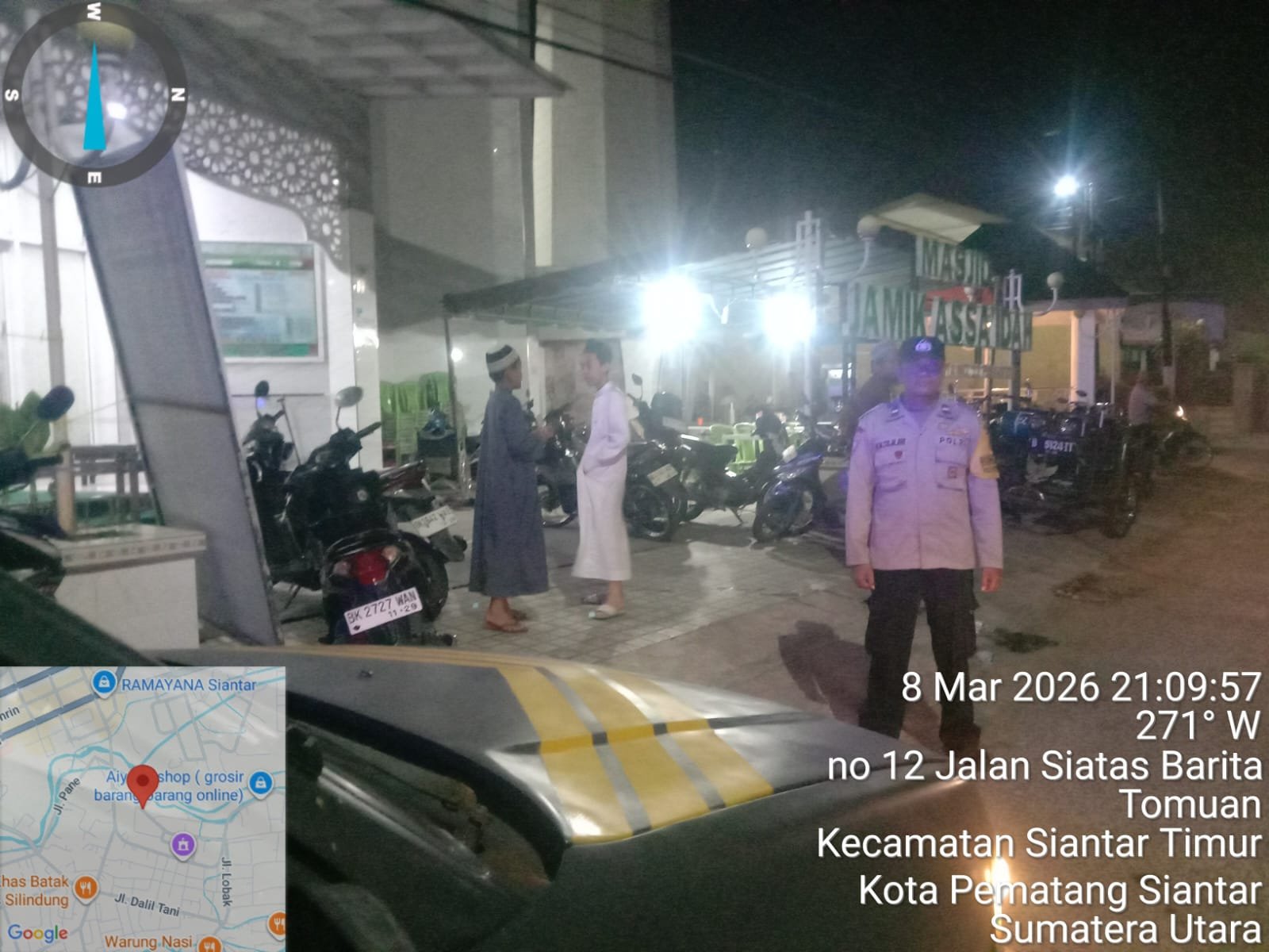 Pematangsiantar | DelikSumut – Polres Pematangsiantar melalui Bhabinkamtibmas Polsek Siantar Timur Aipda Hardi Silalahi dan Aipda Manoa Sitanggang melaksanakan patroli dan monitoring Sholat Tarawih di Mesjid Wilayah hukum Polsek Siantar Timur, Minggu (8/3/2026) malam, pukul 20.30 WIB.