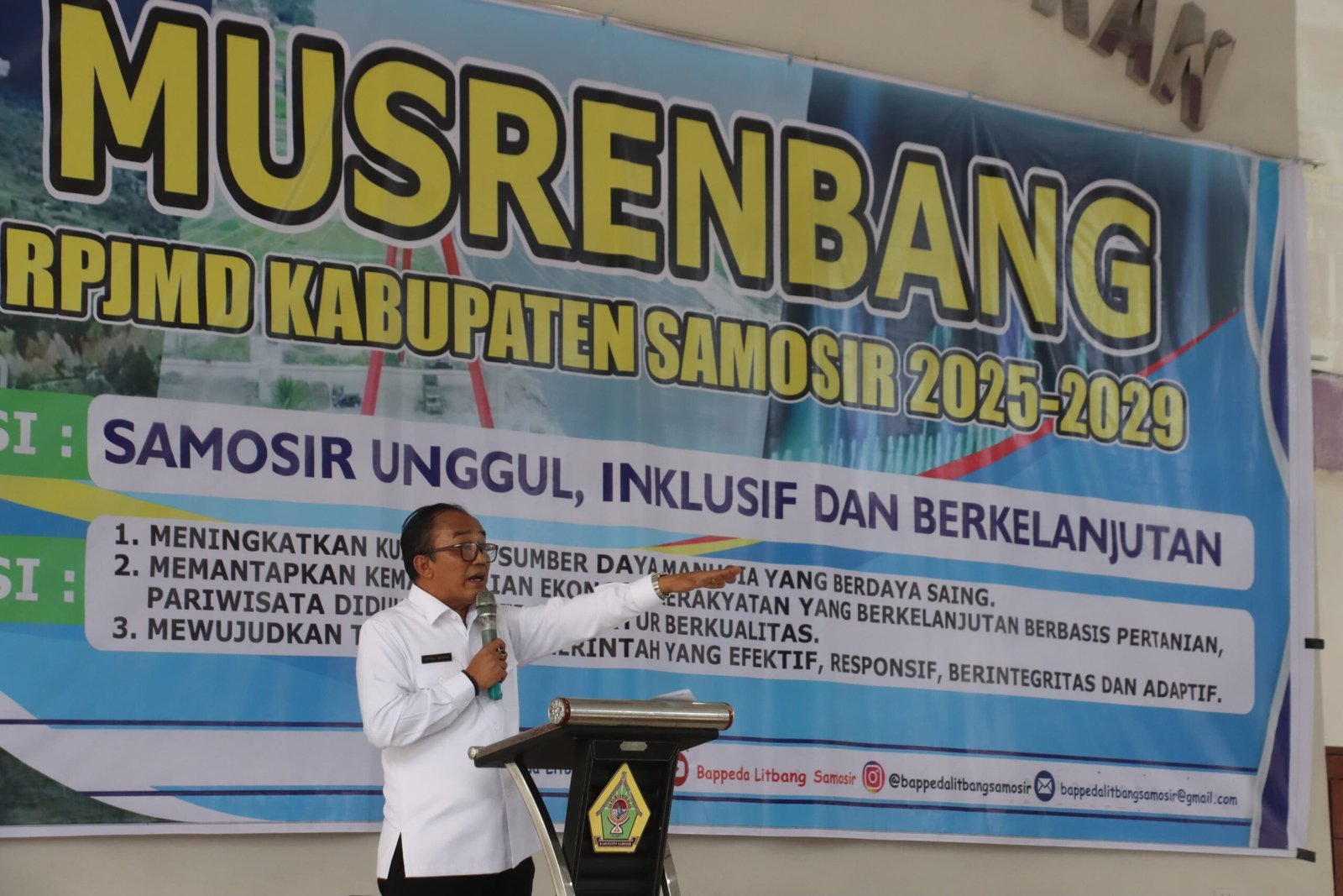 Wakil Bupati Samosir Ariston Tua Sidauruk menyampaikan pelaksanaan Musrenbang ini guna penajaman, penyelarasan dan klarifikasi usulan masyarakat terhadap prioritas pembangunan yang ditetapkan. Disebut Ariston bahwa, Visi misi yang diusung pada RPJMD Kabupaten Samosir 2025-2029 mendukung dan selaras dengan RPJMN “Bersama Indonesia Maju Menuju Indonesia Emas 2045” dan RPJMD Sumatera Utara “Sumatera Utara Unggul dan Berkelanjutan”. Dan untuk penyempurnaannya, Wabup meminta seluruh stakeholder untuk memberi masukan dan tanggapan sehingga RPJMD tersebut dapat disempurnakan.