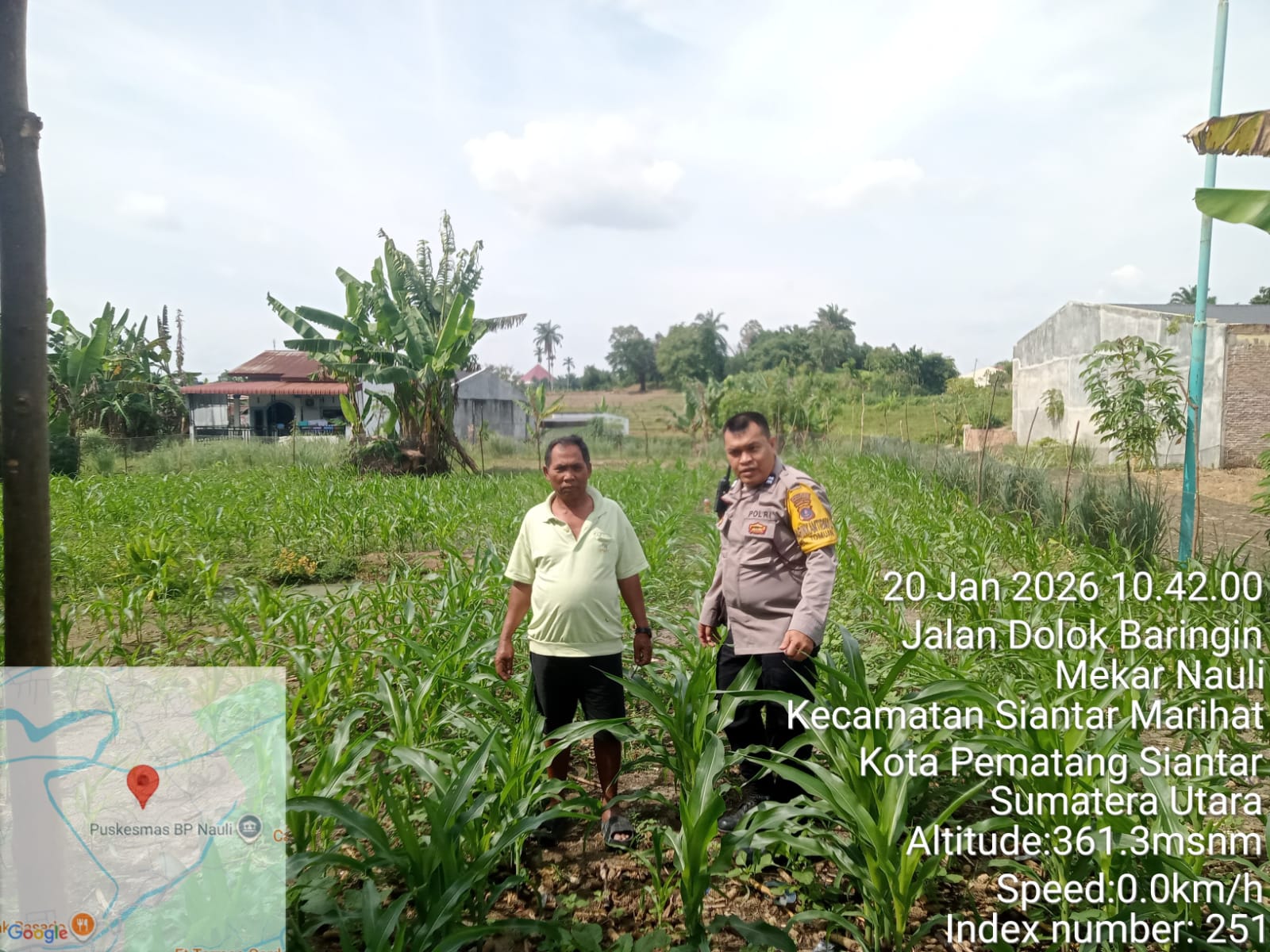 Pematangsiantar | DelikSumut – Polsek Siantar Timur Polres Pematangsianțar melalui Bhabinkamtibmas Kelurahan Tomuan AIPTU Okto Sihole sambangi ladang jagung warga binaan Bapak Marlon Simamora di Jalan Dolok Baringin, Kelurahan Mekar Nauli, Kecamatan Siantar Marihat, Kota Pematangsiantar, Selasa (20/1/2025) pagi pukul 10.00 Wib.