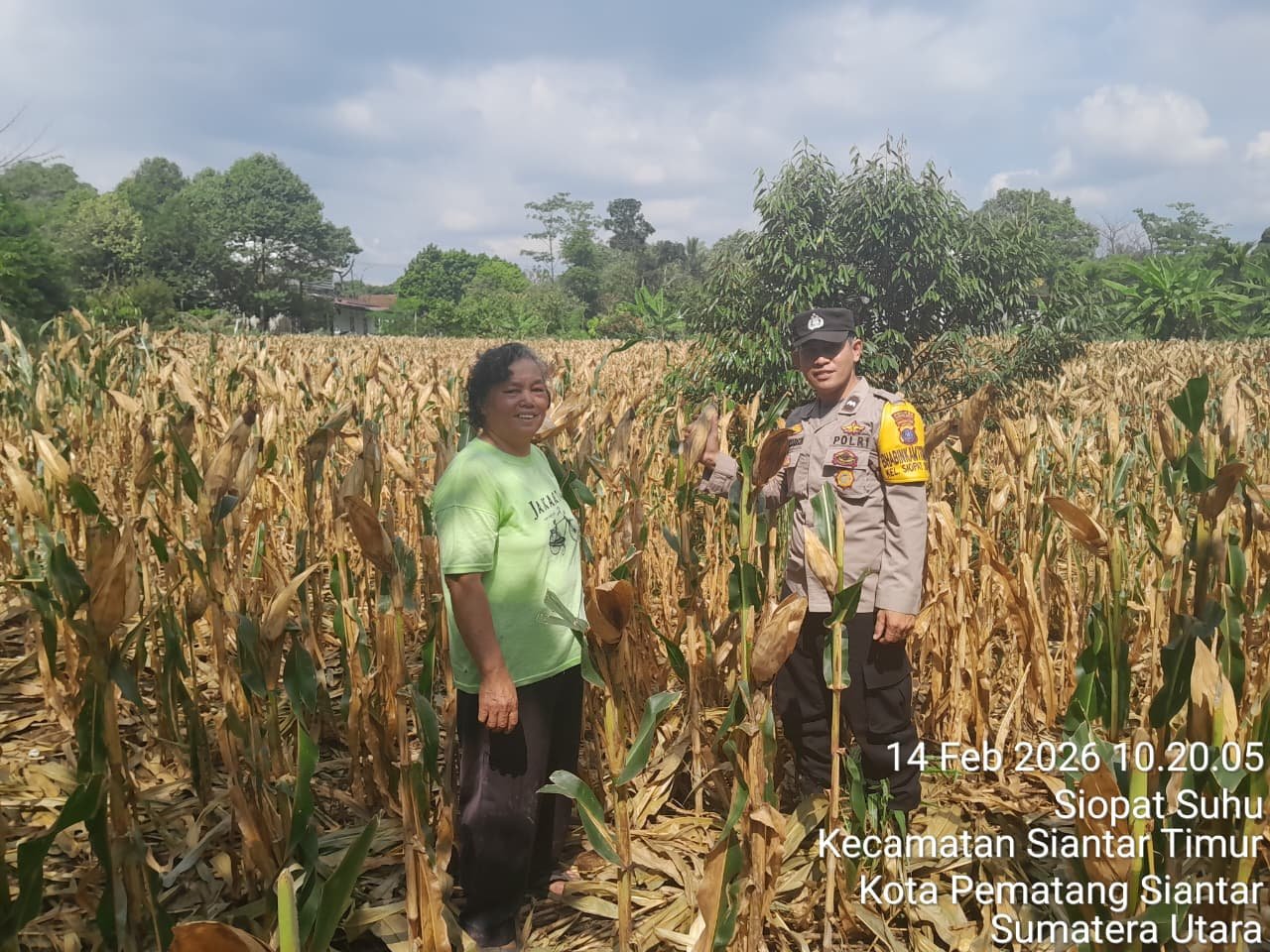 Pematangsiantar| DelikSumut – Polsek Siantar Timur Polres Pematangsiantar melalui Bhabinkamtibmas Kelurahan Siopat Suhu Aipda Vicktorson Saragih S.T sambangi ladang jagung warga binaan di Jalan Sangnawaluh, Kompleks Asrama Putri Kampus Universitas HKBP Nommensen, Kelurahan Siopat Suhu, Kecamatan Siantar Timur, Kota Pematangsiantar, Sabtu (14/2/2026) pagi, sekira pukul 10.20 WIB.
