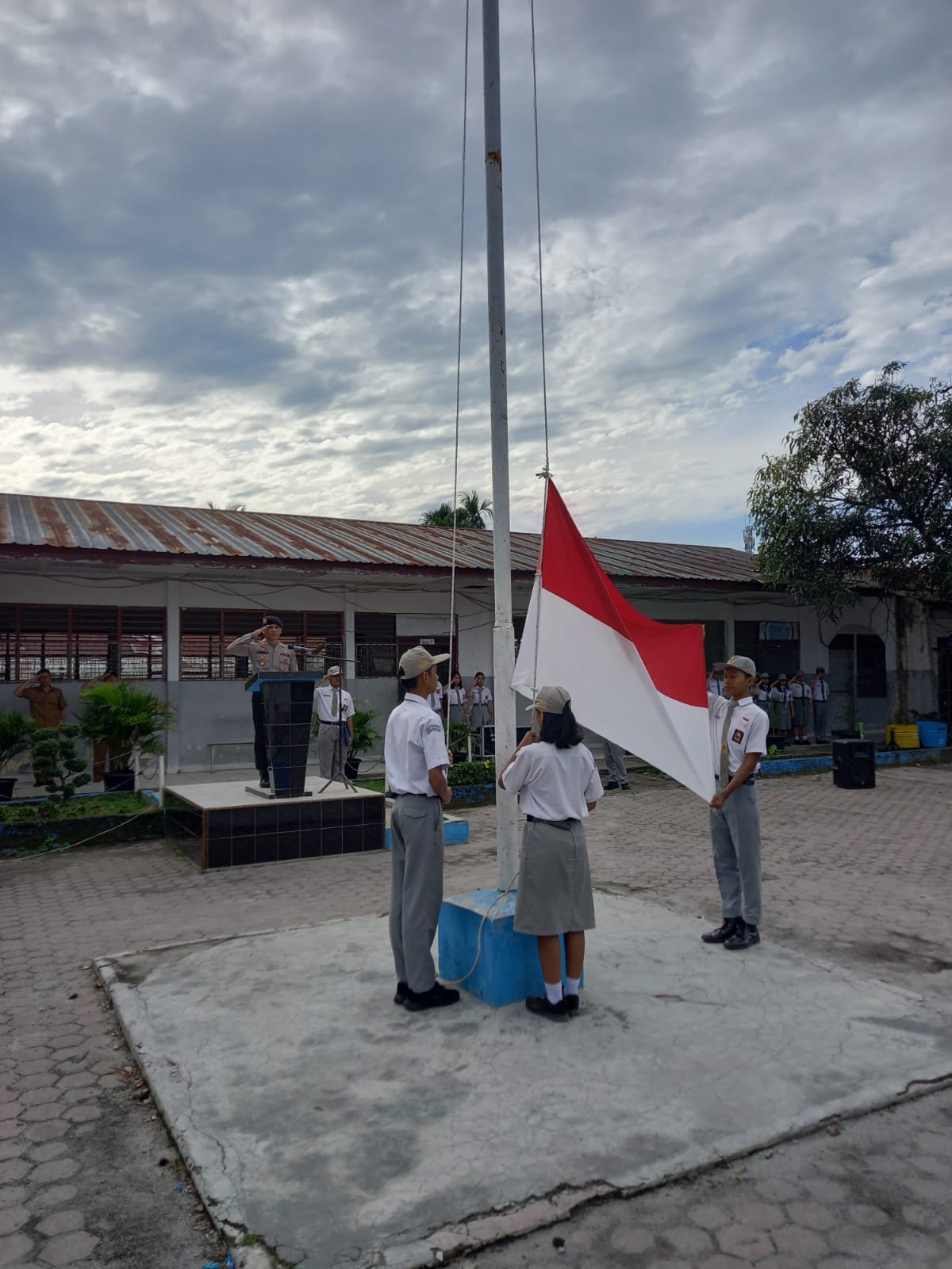 Upacara tersebut diikuti Kepala Sekolah, para guru dan siswa siswi SMA Negeri 3, serta personil Sat Samapta diantara IPDA Vernando Sinaga, AIPTU Albersius Saragih, AIPTU Frans Saragih dan BRIPKA Suwanda Dwi Nugroho.