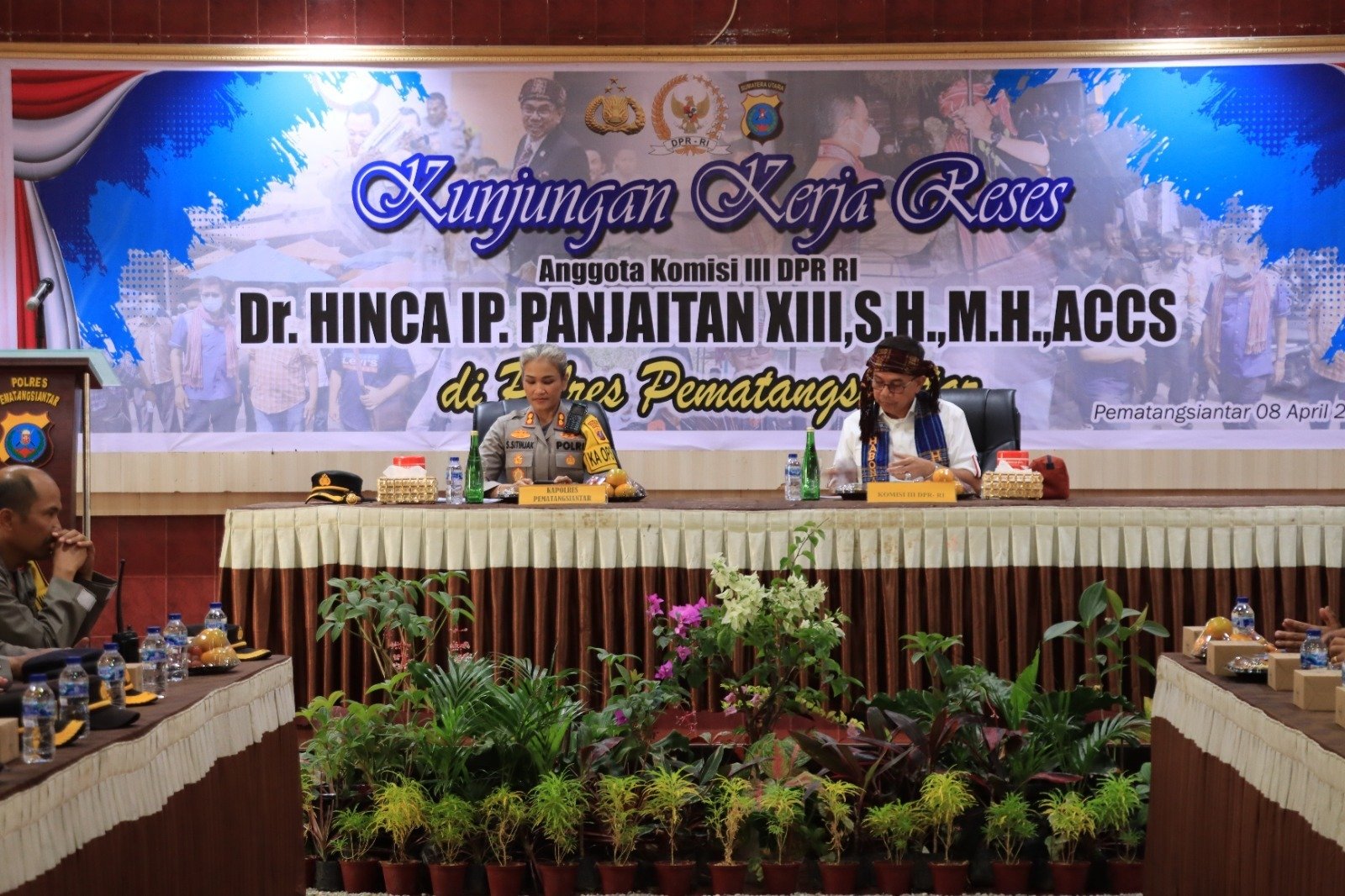 Pada kesempatan itu Hinca Panjaitan hadir didampingi Tenaga Ahli Komisi III Markus purba memberikan titipan kepada anggota DPRD Kota Pematangsiantar untuk menjaga dan dukung penuh Polres Pematangsiantar. Tidak akan mungkin Kota Pematangsiantar tertib aman dan lancar kalau tidak ada kepolisian.