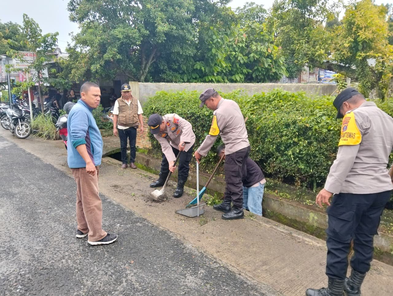 Pematangsiantar | DelikSumut – Kapolsek Siantar Selatan IPTU Priston Simbolon bersama personil mengikuti gotong royong di Jalan Marimbun, Kelurahan Martimbang, Kecamatan Siantar Selatan, Kota Pematangsiantar tepatnya didepan Kantor Kelurahan Martimbang, Jumat (28/11/2025) pagi sekira pukul 08.00 Wib.