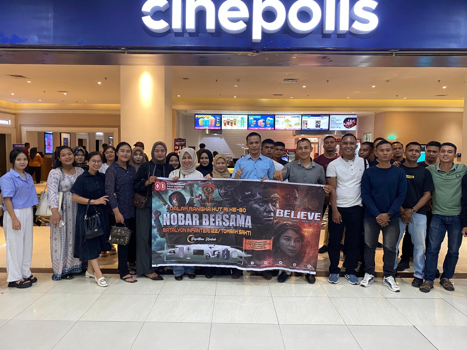 Simalungun | DelikSumut – Batalyon Infanteri 122/Tombak Sakti mengadakan Nonton Bareng (Nobar) Film Believe bersama dengan mengajak masyarakat binaan, yang mengangkat tema perjuangan, keteguhan hati, dan nilai-nilai patriotisme, memberikan inspirasi dan motivasi bagi seluruh peserta nobar, bertempat di Bioskop Cinepolis Siantar, Jln. Medan, Pematang Siantar, Naga Pita., Kecamatan Siantar Martoba, Kota Pematang Siantar, Sumatera Utara,(31/07/2025).