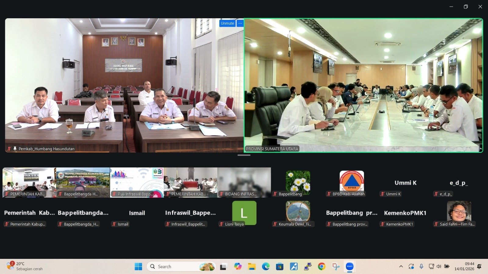 Pemerintah Kabupaten Humbang Hasundutan diwakili Sekda Chiristison Rudianto Marbun didampingi para pimpinan OPD (Organisasi Perangkat Daerah) terkait mengikuti Rapat Koordinasi Daerah Penyusunan Pedoman Strategis untuk Rehabilitasi dan Rekonstruksi Pascabencana di Sumatera Utara melalui zoom meeting dari Ruang Rapat Inspirasi Kantor Bupati Humbang Hasundutan, Rabu 14 Januari 2026.