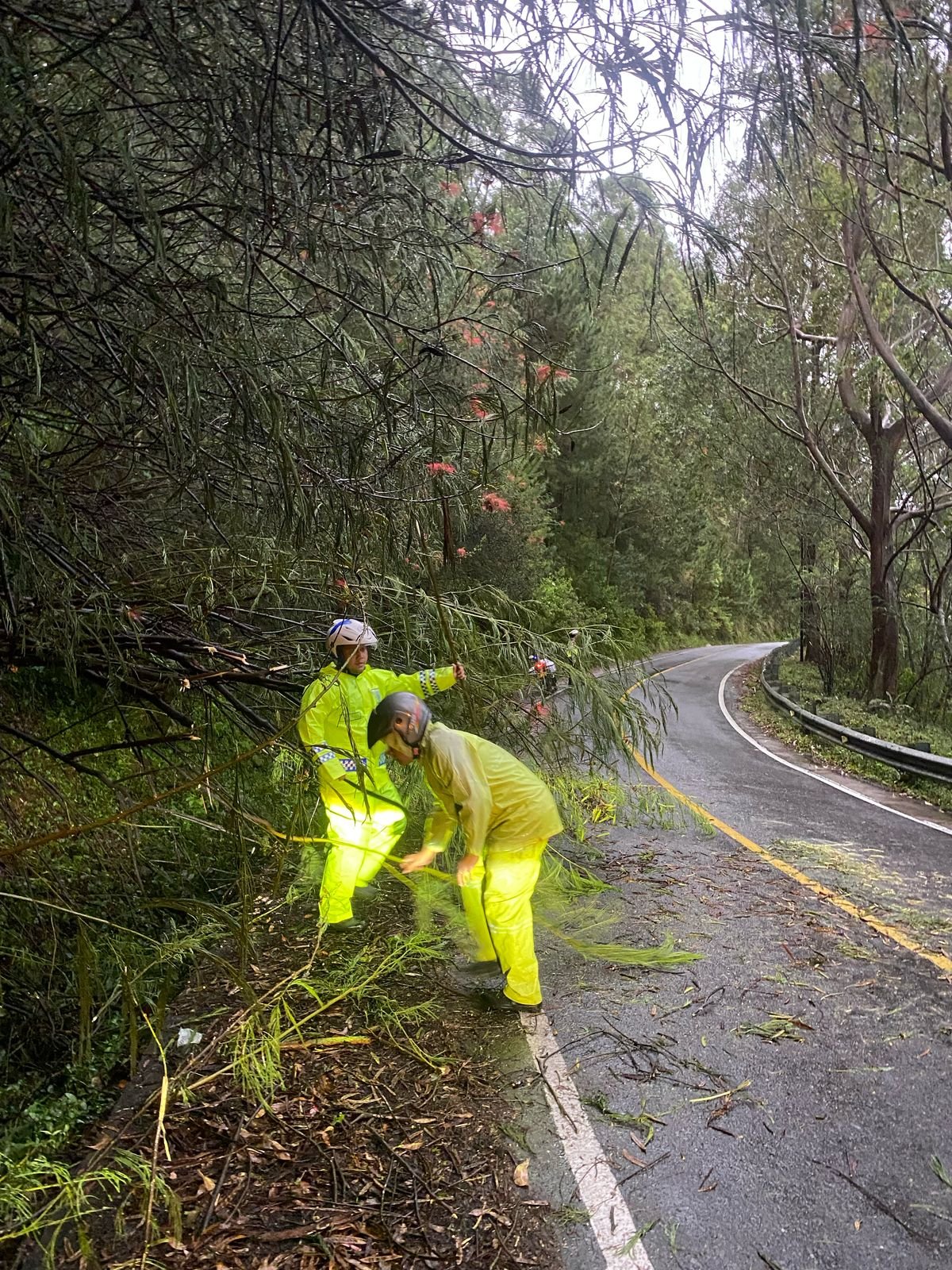 Personel Polres Samosir Sigap Rapikan Pohon yang Ganggu Lalu Lintas di Jalan Tele