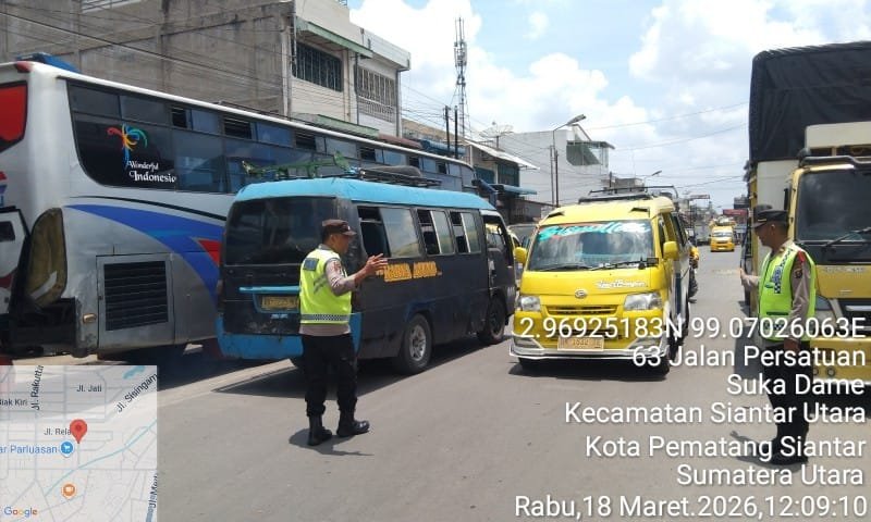 Pematangsiantar | DelikSumut – Polres Pematangsiantar melalui personil Pos Pengamanan (Pam) II Parluasan Operasi Ketupat Toba 2026 respon cepat melakukan penguraian kemacetan di Jalan Patuan Nagari, Kelurahan Sukadame, Kecamatan Siantar Utara, Kota Pematangsiantr, tindaklanjut laporan masyarakat di Call Center 110, Rabu (18/3/2026) siang sekira pukul 12.07 Wib.