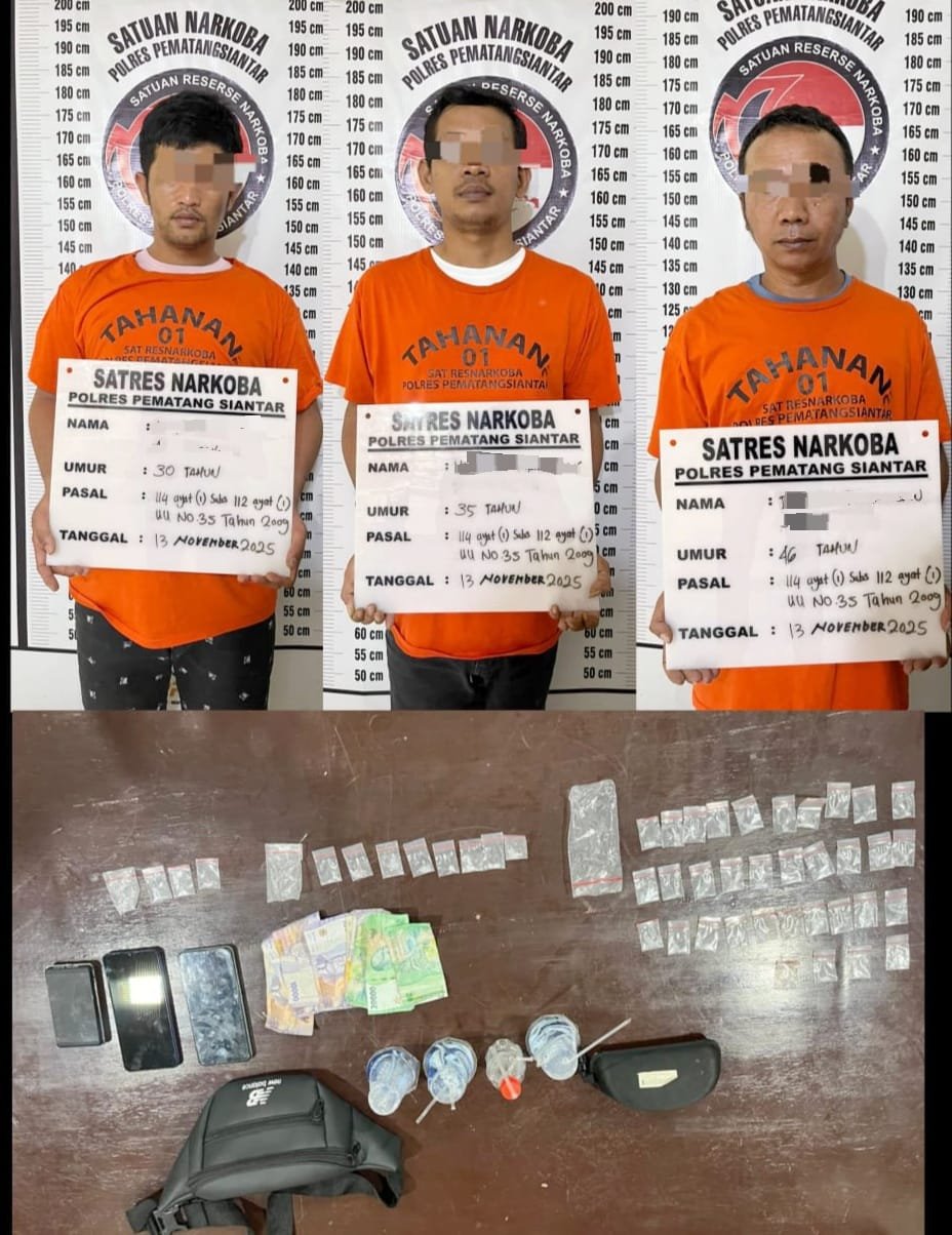 Kamis (13/11/2025) sekira pukul 13.30 WIB menangkap tiga (3) orang laki laki miliki narkotika jenis sabu berat bruto 18,1 gram di dalam rumah Jalan Sibatu-batu, Gang Pulau Batu, Kelurahan Bah Kapul, Kecamatan Siantar Sitalasari, Kota Pematangsiantar.