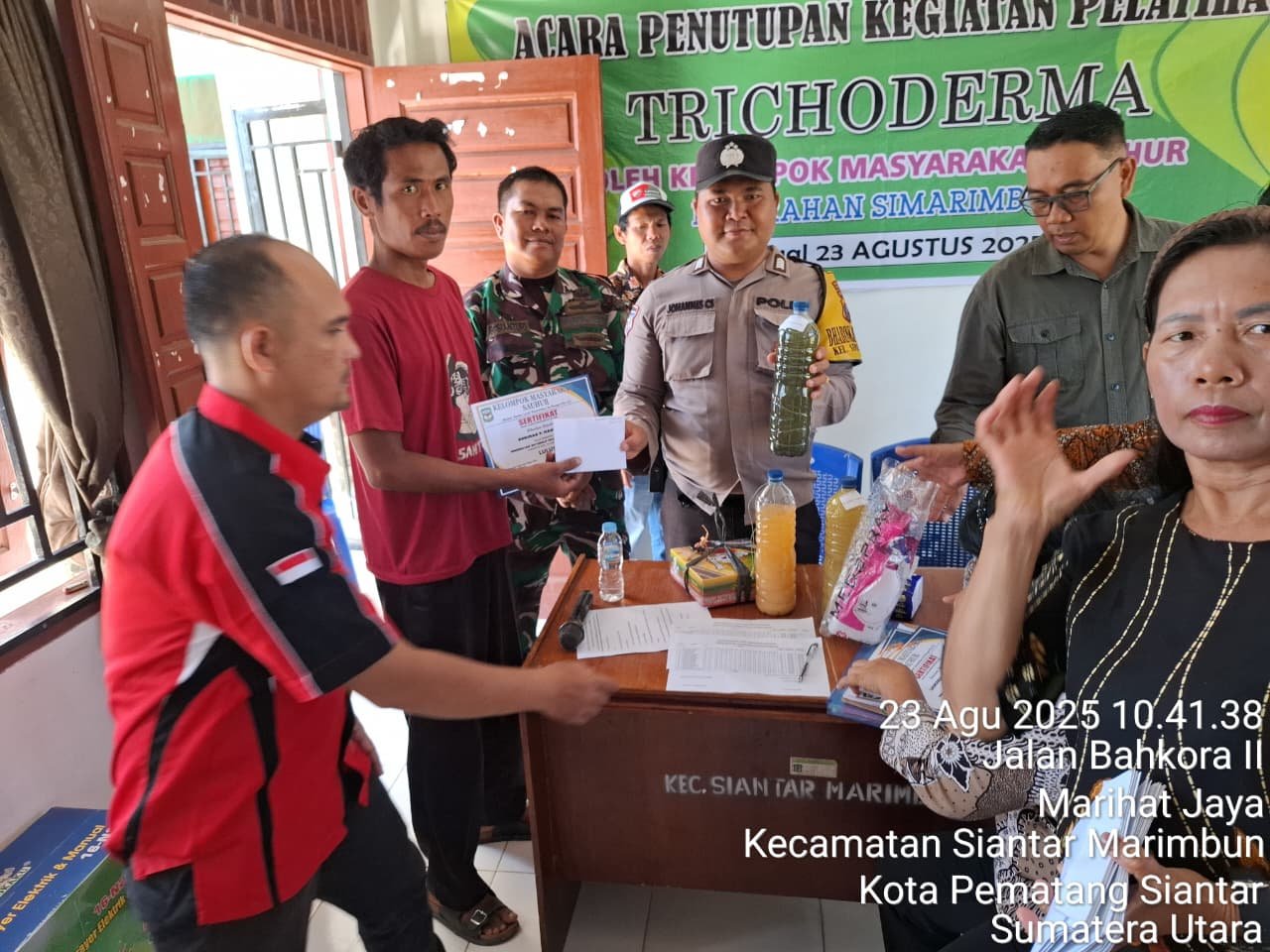 Pematangsiantar | DelikSumut – Polsek Siantar Marihat, Polres Pematangsiantar melalui Bhabinkamtibmas Bripka Johannes C. Siregar menghadiri kegiatan Penutupan Pelatihan Tricoderma Pemberdayaan Masyarakat yang berlangsung di Kantor BPP/Badan Penyuluhan Pertanian Dinas Pertanian dan Ketahanan Pangan Kota Pematangsiantar, Jln. Jalan Bahkora 2, Gang Tulip, Kelurahan Marihat Jaya, Kecamatan Siantar Marimbun, Sabtu (23/8/2025) pagi pukul 10.00 Wib.