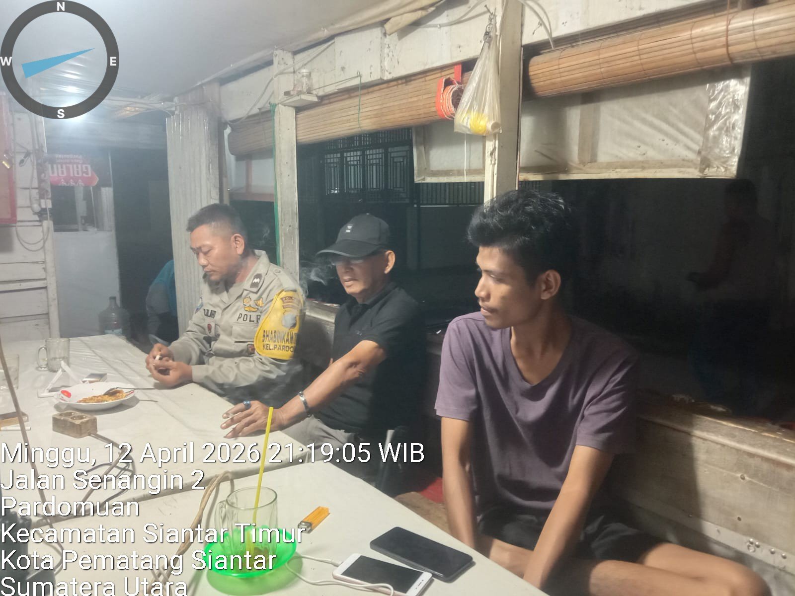 Pematangsiantar | DelikSumut – Polsek Siantar Timur Polres Pematangsiantar melalui personil Piket Bhabinkamtibmas Aipda Hardi Silalahi dan Aipda Manoa Sitanggang melaksanakan kegiatan SALING (Sapa Siskamling) di Poskamling Jalan Senangin, Kelurahan Pardomuan, Kecamatan Siantar Timur, Kota Pematangsiantar, Minggu (12/4/2026) malam, sekira pukul 21:15 WIB.