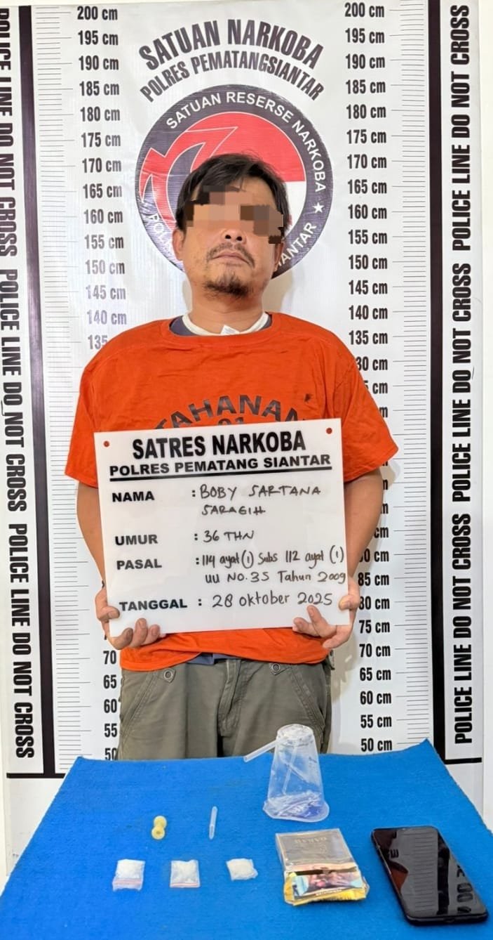 Pematangsiantar | DelikSumut – Satuan Reserse Narkoba Polres Pematangsiantar berhasil menangkap seorang laki laki Asal Kabupaten Simalungun memiliki narkotika jenis sabu berat bruto 4,47 Gram di dalam sebuah kamar Hotel Alexander Graha, Jalan Jalan Saribu Dolok, Kelurahan Tong Marimbun, Kecamatan Siantar Marimbun, Kota Pematangsiantar, Selasa (28/10/2025) Kemarin siang sekira pukul 13.40 WIB.