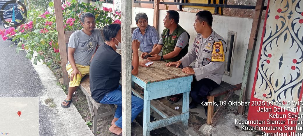 Pematangsiantar | DelikSumut – Polsek Siantar Timur Polres Pematangsiantar melalui Bhabinkamtibmas Kelurahan Kebun Sayur Bripka Manoa Sitanggang sambangi masyarakat di Jalan Dalil Tani, Kelurahan Kebun Sayur, Kecamatan Siantar Timur Kota Pematangsiantar, Kamis (9/10/2025) pagi pukul 09.45 WIB.