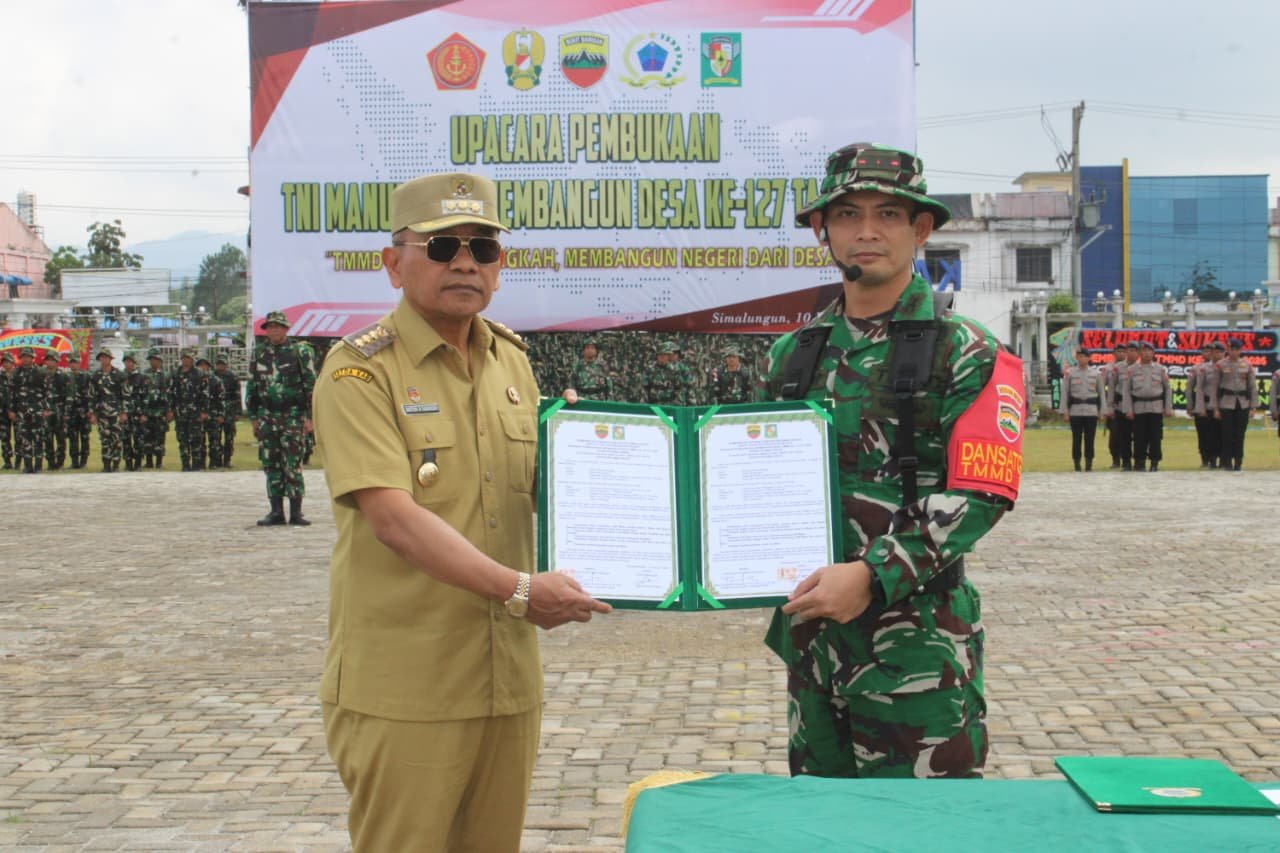 Simalungun | DelikSumut – Program TNI Manunggal Membangun Desa (TMMD) Ke-127 Tahun Anggaran 2026 Kodim 0207/Simalungun resmi dibuka melalui upacara yang berlangsung khidmat pada Selasa, (10/2/2026) pukul 09.00 WIB, bertempat di Lapangan Kantor Bupati Simalungun, Jalan Lintas Siantar–Saribu Dolok, Kelurahan Sondi Raya, Kecamatan Raya, Kabupaten Simalungun.