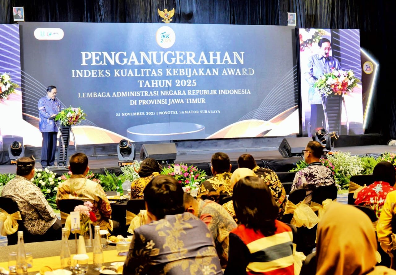 Penghargaan IKK Award 2025 diserahkan langsung oleh Kepala LAN RI Muhammad Taufiq kepada pemerintah daerah yang dinilai memiliki kualitas kebijakan unggul, efektif, dan mampu mendorong peningkatan mutu pelayanan publik. Selain Taufiq, hadir juga Staf Khusus Menteri PANRB Bidang Pengendalian Mutu Prinsip dan Retrokasi Tasdik Kinanto serta Gubernur Jawa Timur Emil Elestianto Dardak.