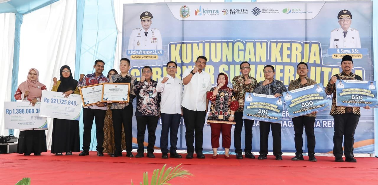 Acara tersebut juga diisi dengan penandatanganan Perjanjian Kerja Sama antara Pemprov Sumut, KEK Sei Mangkei, PT KINRA, dan BPJS Ketenagakerjaan Wilayah Sumbagut, serta penyerahan simbolis klaim Jaminan Kematian dan Jaminan Kecelakaan Kerja kepada penerima manfaat.